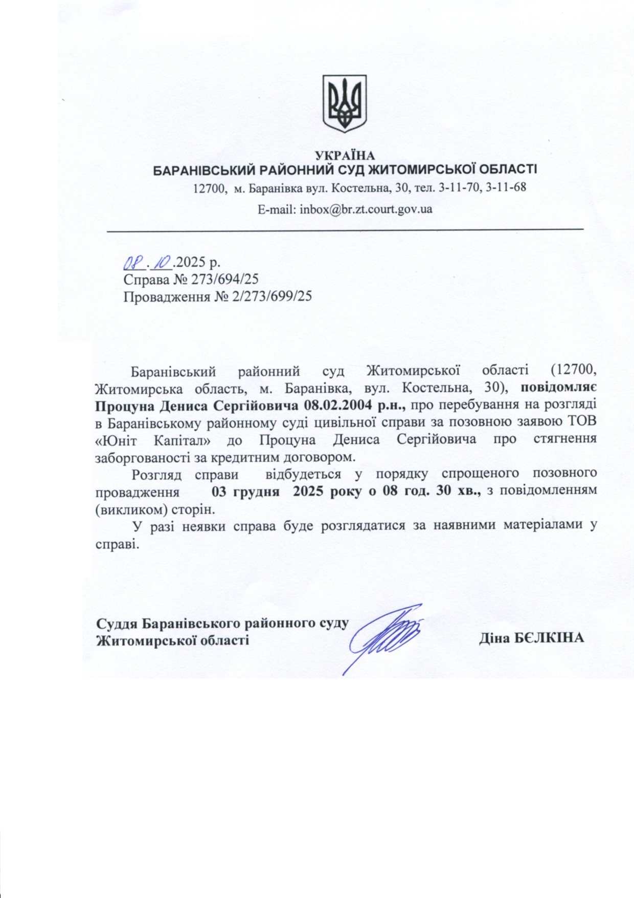 Оголошення про виклик до суду Процуна Дениса Сергійовича, справа № 273/694/25