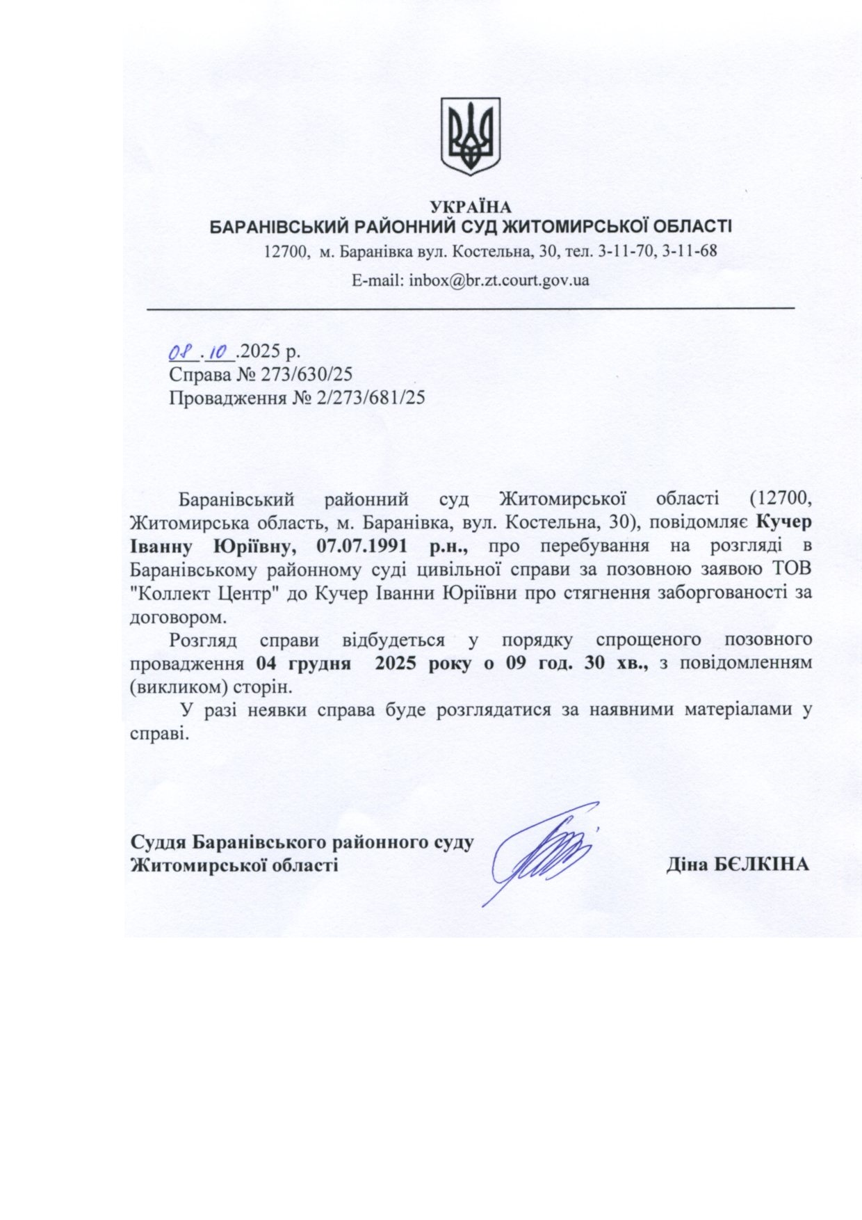 Оголошення про виклик до суду Кучер Іванну Юріївну, справа № 273/630/25
