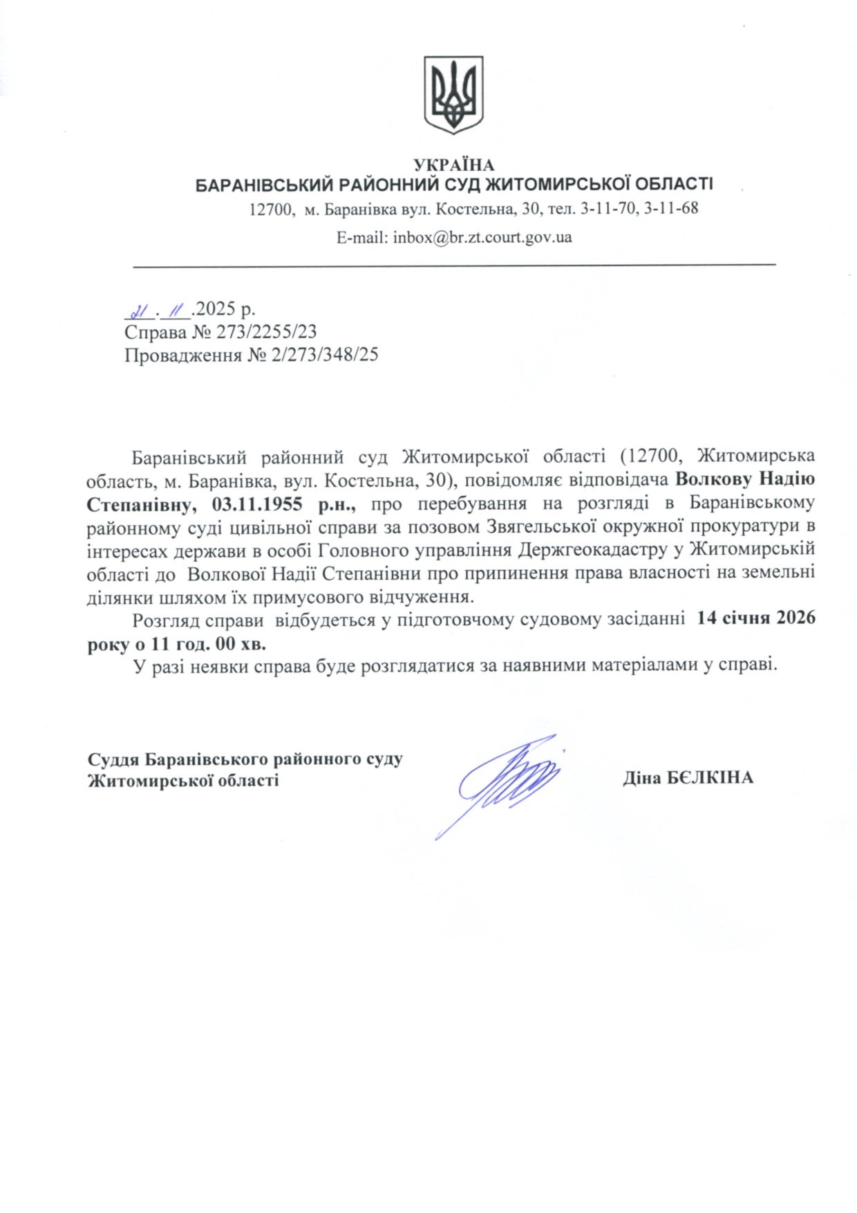 Оголошення про виклик до суду Волкову Надію Степанівну, справа № 273/2255/23