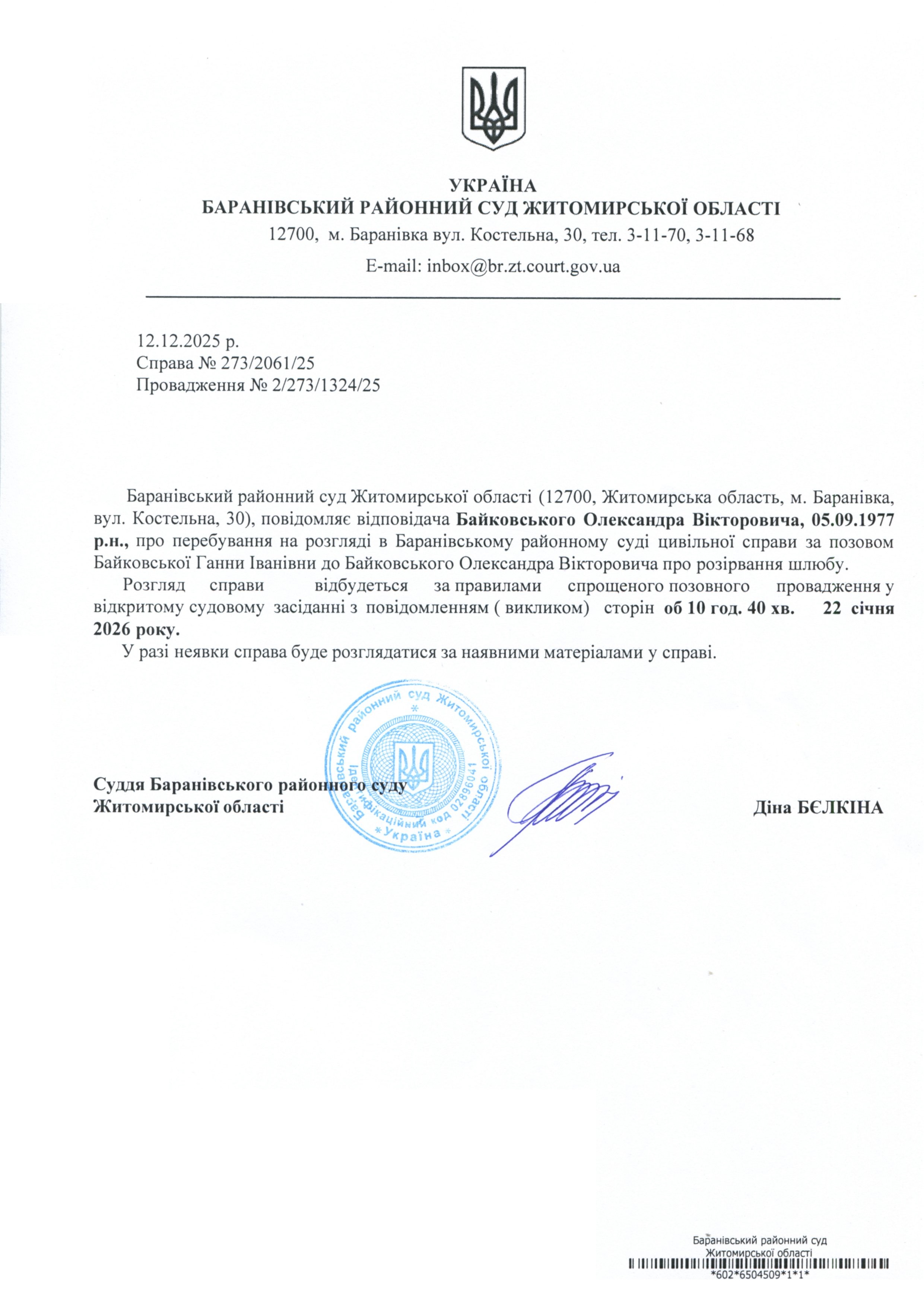 Оголошення про виклик до суду Байковського Олександра Вікторовича, справа № 273/2061/25