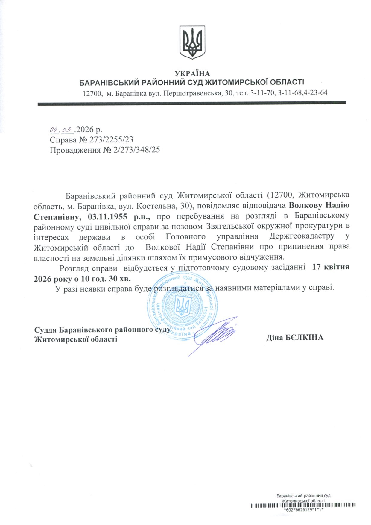 Оголошення про виклик до суду Волкову Надію Степанівну, справа № 273/2255/23