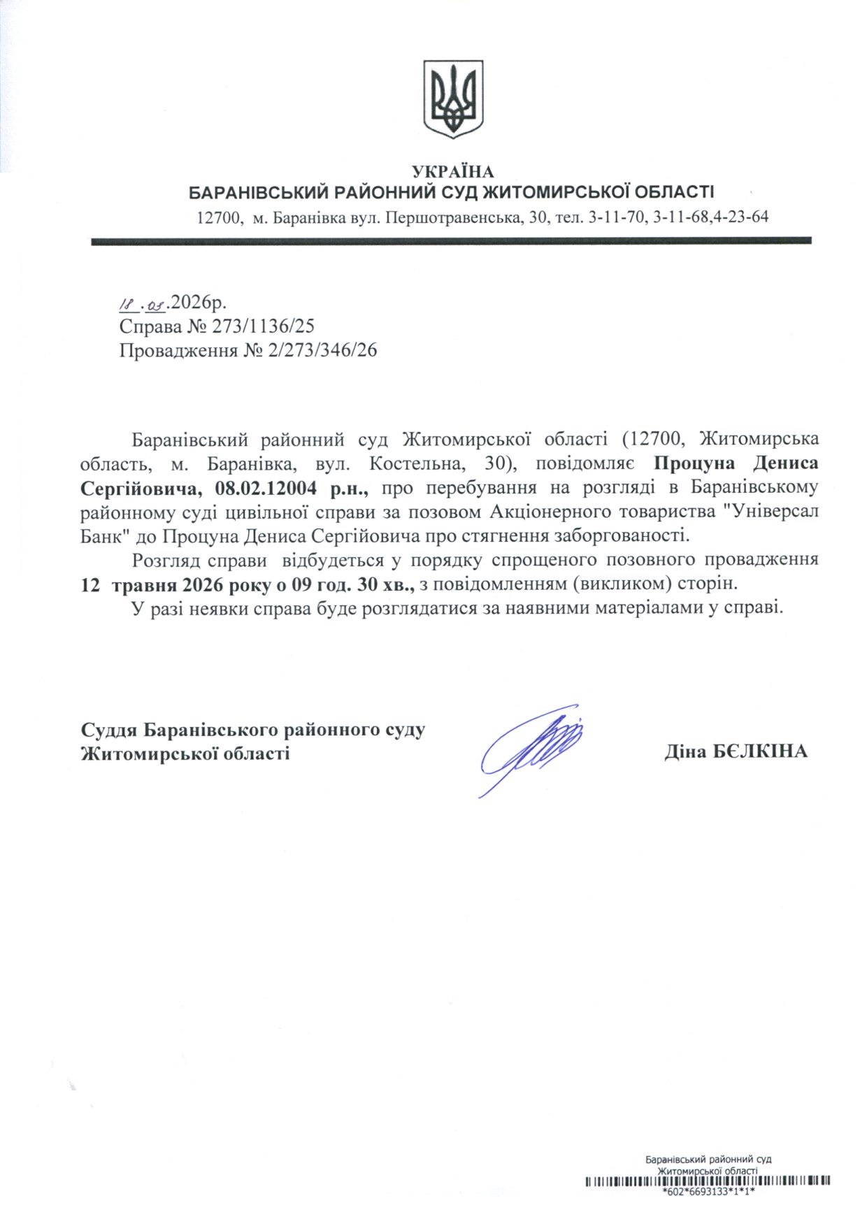 Оголошення про виклик до суду Процуна Дениса Сергійовича, справа № 273/1136/25