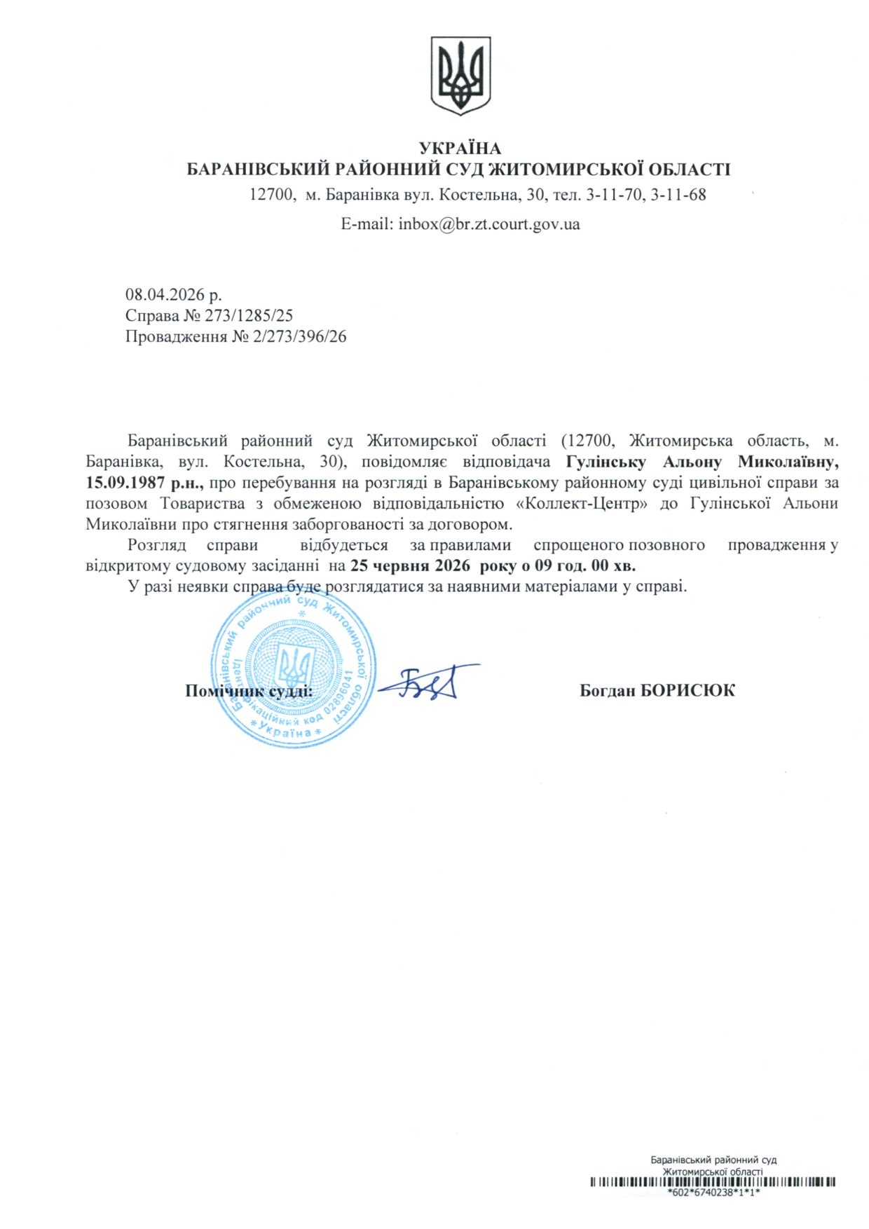 Оголошення про виклик до суду Гулінську Альону Миколаївну, справа № 273/1285/25
