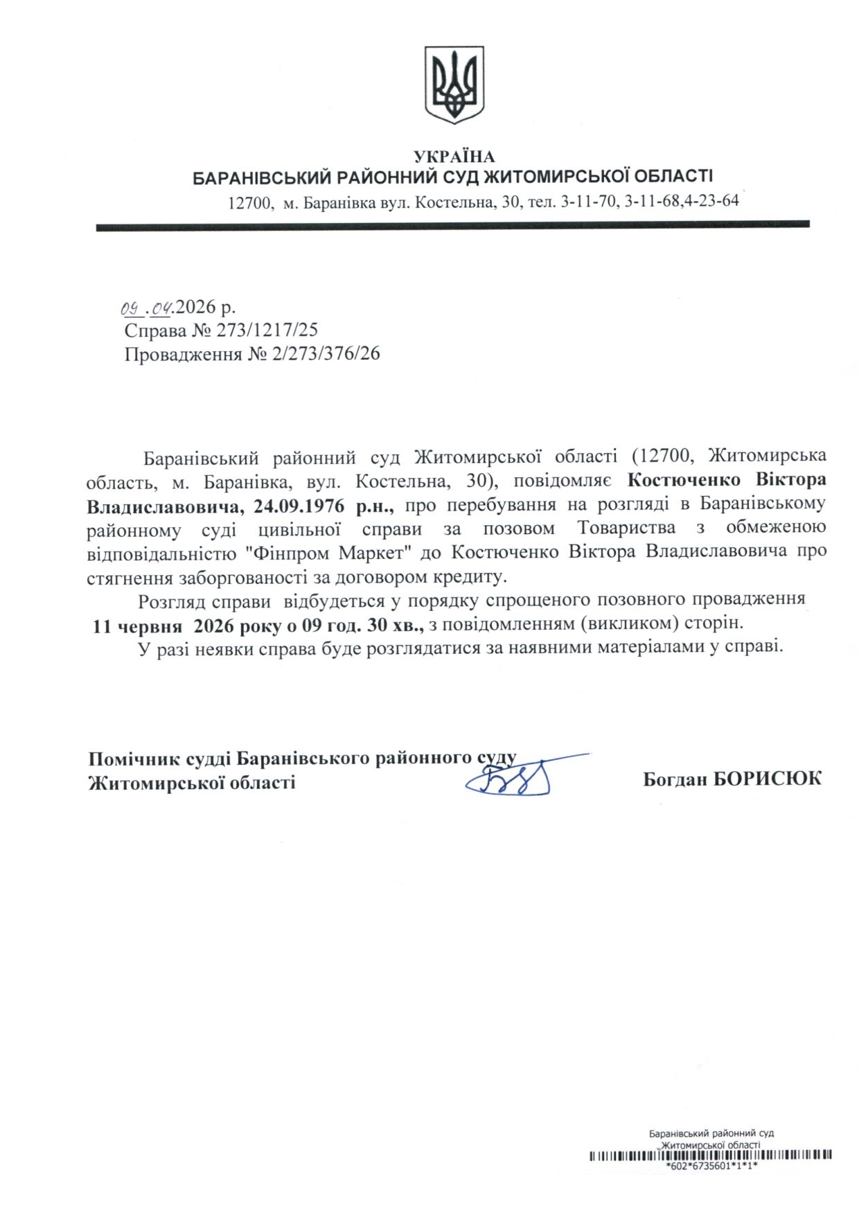 Оголошення про виклик до суду Костюченко Віктора Владиславовича, справа № 273/1217/25
